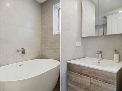 Renovated bathroom with freestanding bath + floating vanity