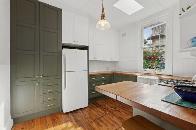 The kitchen's been given a modern glow-up while still keeping character intact. A skylight floods it with natural light, and every detail - from the brass tapware to the shaker doors - hits the sweet spot of heritage meets contemporary.